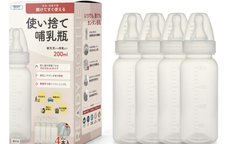 開封してすぐ使える「1回使い切り哺乳瓶」発売 このたび、開封後すぐに使用できる使い捨てタイプの哺乳瓶『レディボトル』が新たに加わりました。 洗浄や消毒の手間がかからない1回使い切り仕様。外出先や移動中、夜間授乳など、準備に時間をかけられない場面でもすぐにお使いいただけます。旅行や帰省時の予備としてはもちろん、災害時などの備えとしても活用いただけます。 本製品は新生児から卒乳期まで対応するワンサイズ設計。クロスカットニップルを採用、空気穴付きで、スムーズな授乳にも配慮しています。 ボトルには見やすい立体目盛りを搭載。最大容量は200ml。キャップにも目盛りが付いており、少量のミルクやお薬を与える…