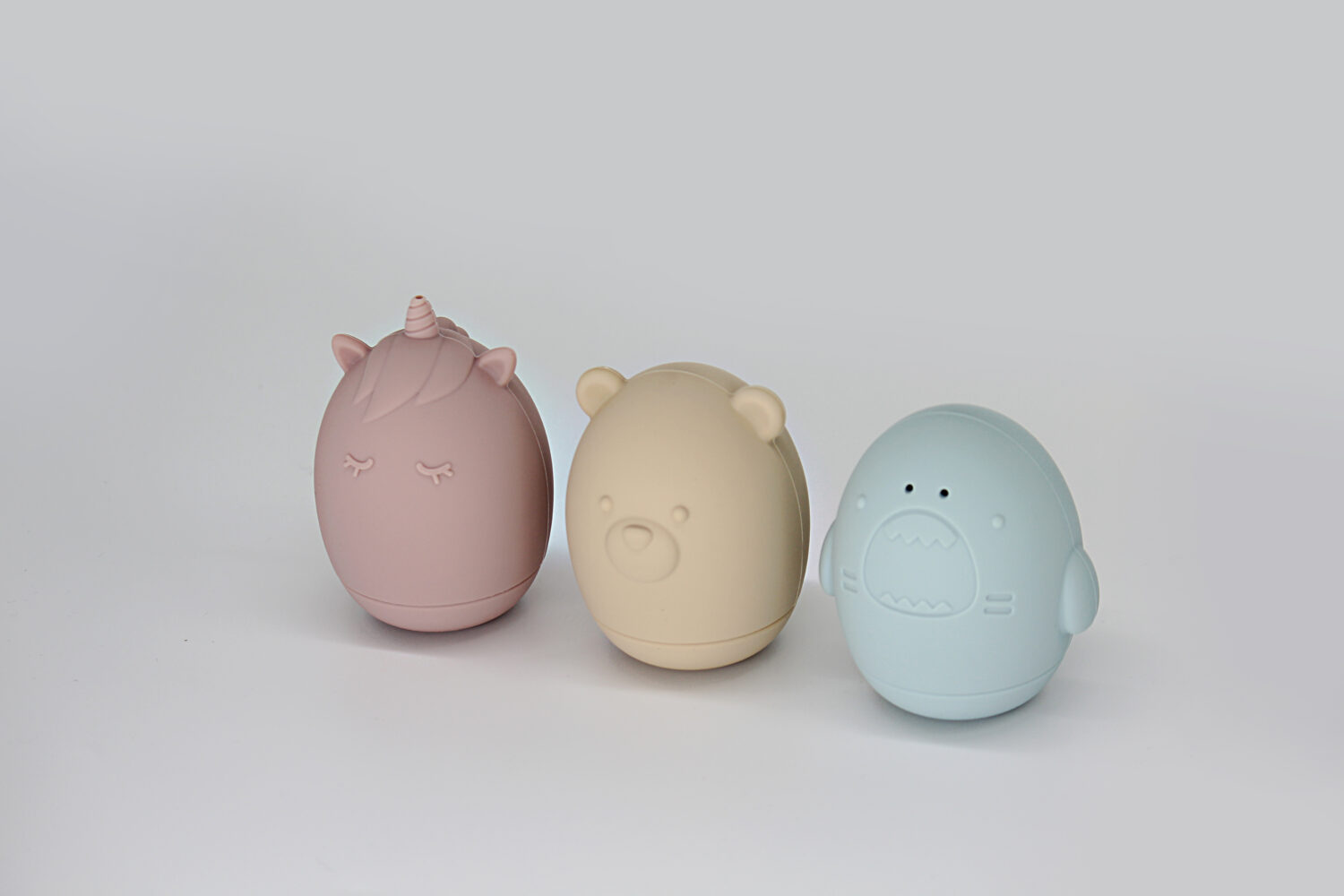 【お風呂やプールで楽しい水あそび】ユニコーンはツノからピューッ、クマは背中からじょうろ風、サメは鼻からちょろ〜。3匹それぞれ違う水の出かたで楽しく遊べます。