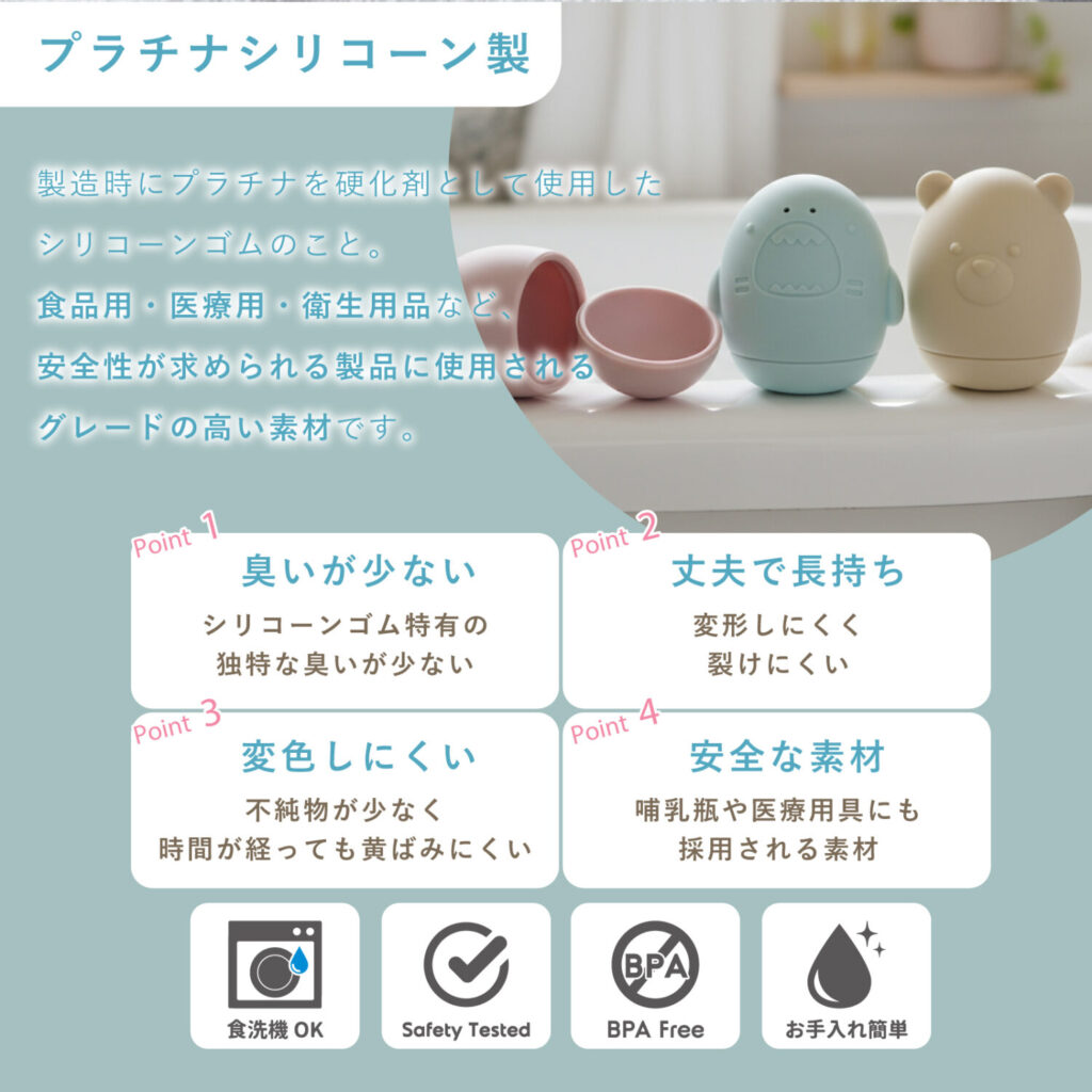 素材はプラチナシリコーンゴムを使用しており、BPA、フタル酸フリー。厚生労働省認定機関による検査も実施済みで、